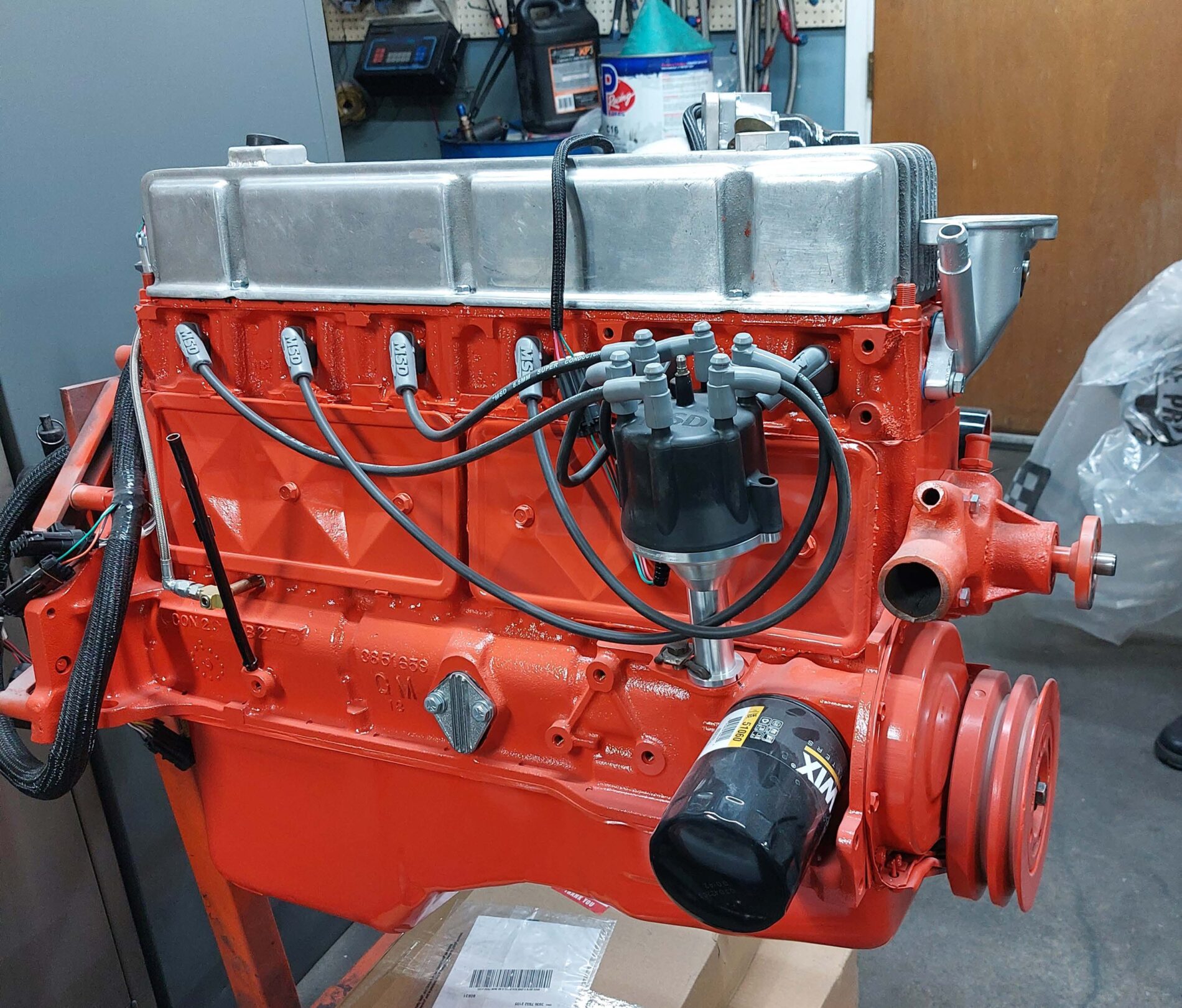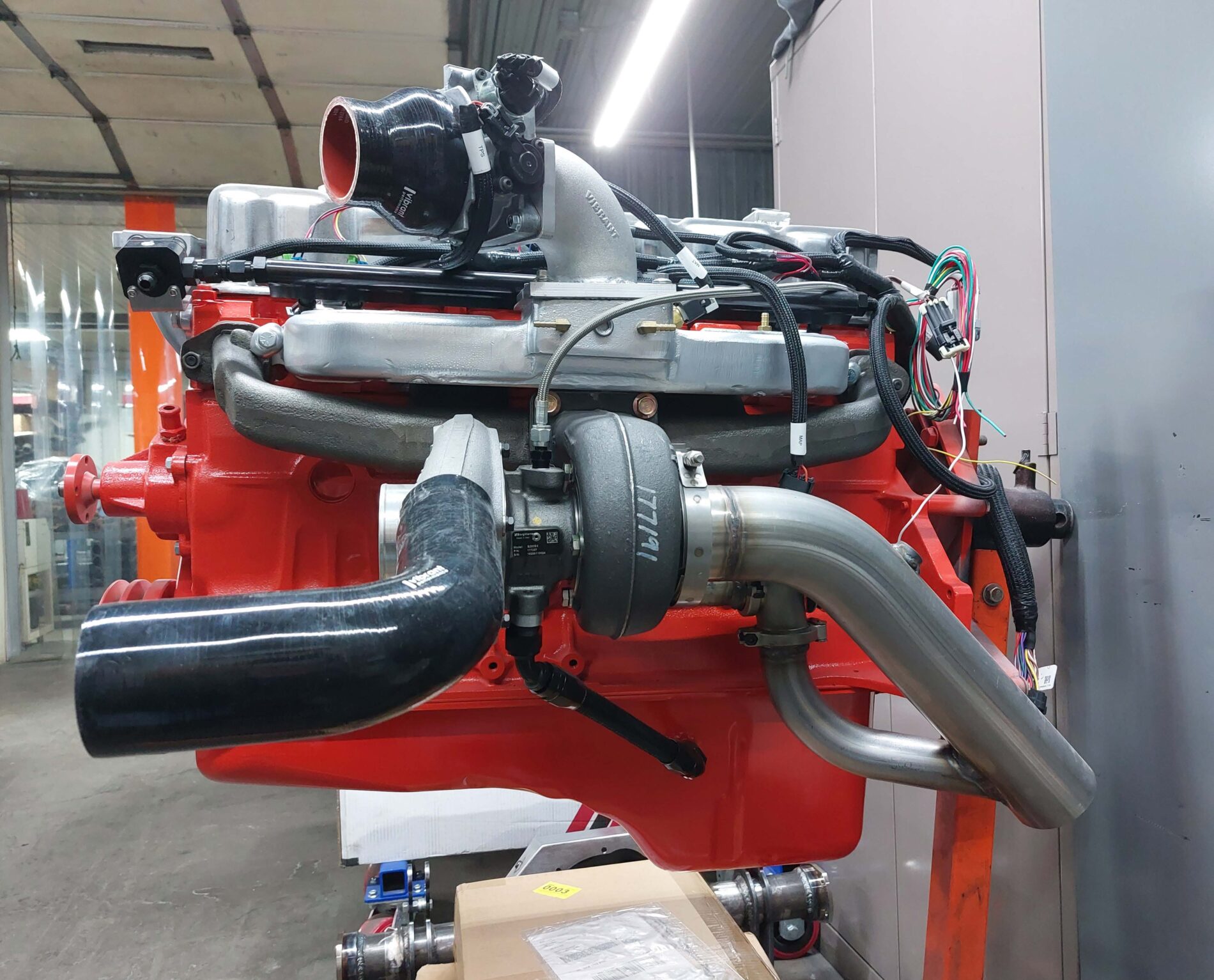 A one of a kind fully customized 6-cyl Chevy 292 ci with a turbo charger added.